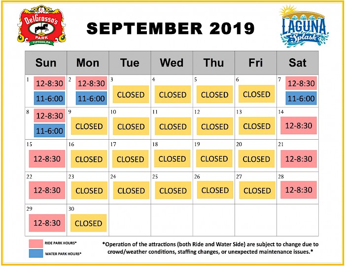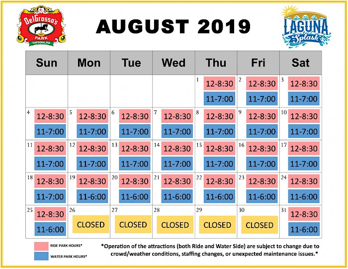 Before you visit Laguna Splash Water Park, check the schedules below to find the hours of operation for the day you plan to come.