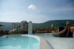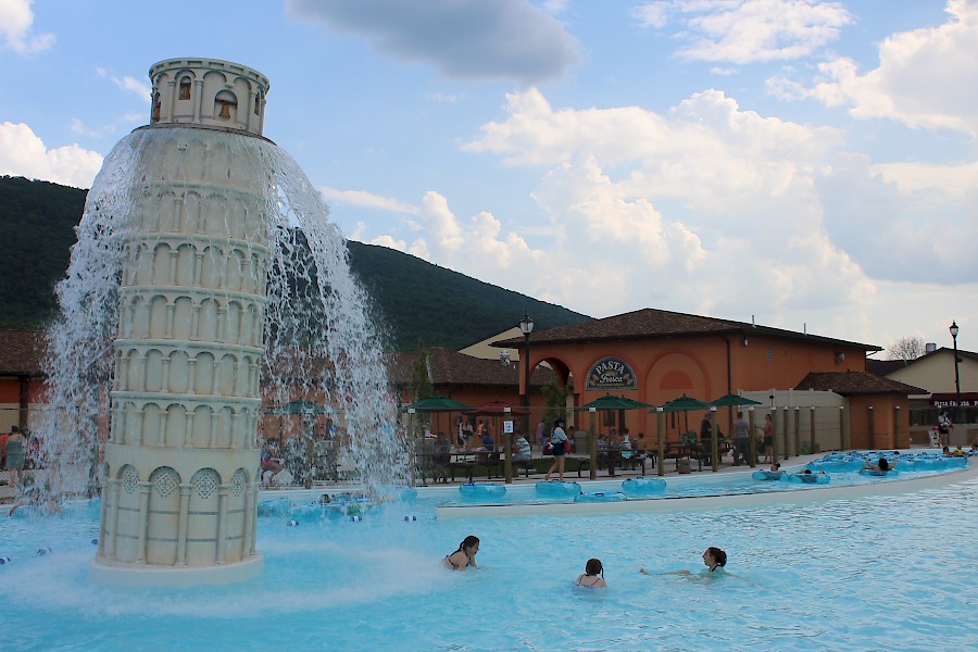 This beautiful replica of the Leaning Tower of Pisa is a popular new water feature that our Bambini Cove guests enjoy, as well as our guests floating down the River Lazio.