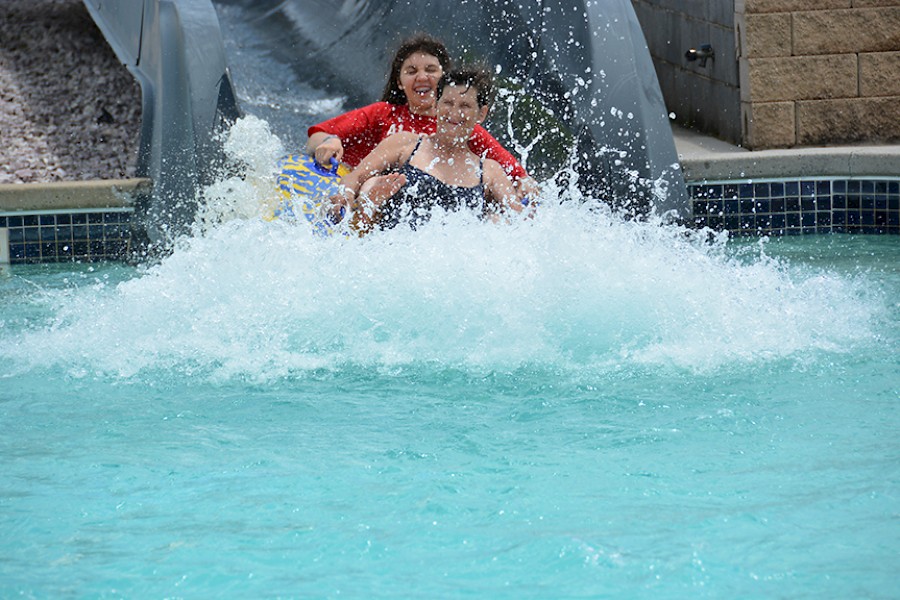 Glasses and goggles are NOT permitted to be worn on the slide. You may wear glasses while waiting in line, but a lifeguard will ask you to secure them away from your face prior to dispatch.