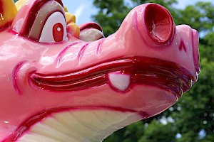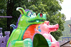 The Dizzy Dragon is a family ride similar to the standard "Teacup" ride. Riders can sit inside the dragon-shaped cars and turn the wheel provided to spin faster or slower during the ride.