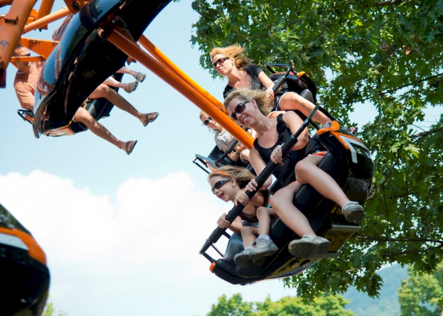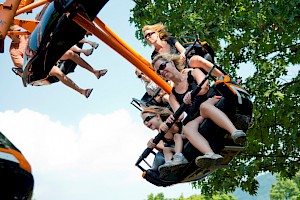 The Paratrooper holds passengers in 12 umbrella-covered cars that swing out as the ride lifts from a horizontal position to a 45-degree angle and rotates counter-clockwise.