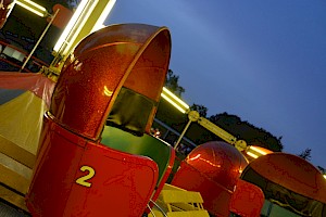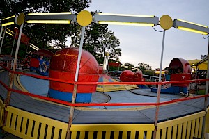 The Tilt-A-Whirl rotates while its 7 cars spin freely on individual tracks.