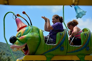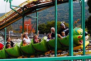 The Wacky Worm is a family coaster that mom, dad and kids can ride together. The Wacky Worm travels along a figure-8 track that has one large hill and various small hills. Riders go around the entire track twice.