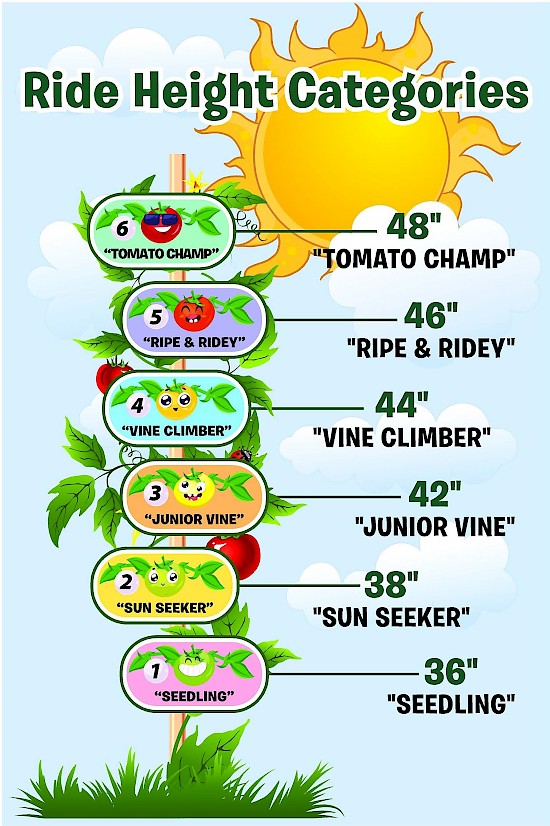 Guests will be measured for height at each individual ride and attraction. Guests wishing to receive an official height measurement for the day can visit the Official Measuring Station at the Rides Office, located behind the Turtle Ride, and will receive a wristband sticker with the character that corresponds with their official height category (as shown below).