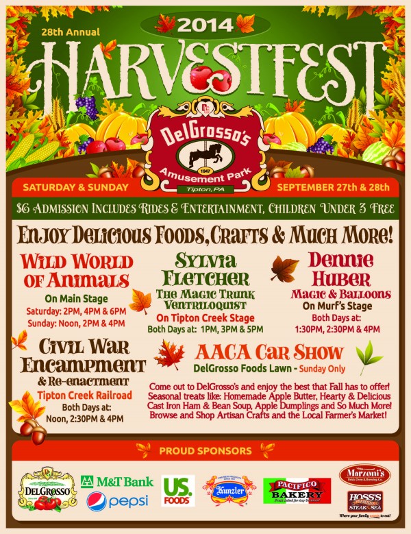 Harvestfest takes place on Saturday and Sunday, September 27th & 28th, 2014. The park grounds open at 8am, craft and food vendor shopping begins at 10am and the rides open at 11am both days. A $6 Admission includes rides and entertainment.