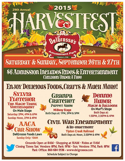 Harvestfest takes place on Saturday and Sunday, September 26 & 27, 2015. The park grounds open at 8am, craft and food vendor shopping begins at 10am, and the rides open at 11am both days. A $6 Admission includes rides and entertainment.