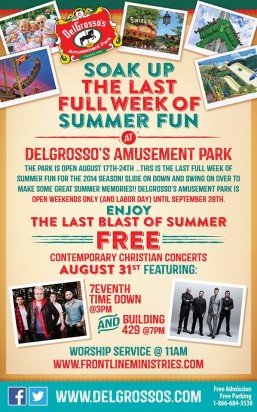 DelGrosso’s Amusement Park will be hosting FrontLine Ministries 16th Annual “Last Blast of Summer” YouthFest. This annual worship service and music ministry will feature two headlining acts: 7Eventh Time Down will perform at 3pm and Building 429 will perform at 7pm. Worship Service will be on the stage at 11am with Lindsay Salyards & David Cadle.