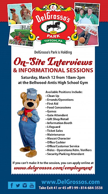 Tipton, Pennsylvania – The Management Team at DelGrosso’s Park & Laguna Splash Water Park will be holding on-site interview and informational sessions on Saturday, March 12th, at the Bellwood High School gym. This event will take place