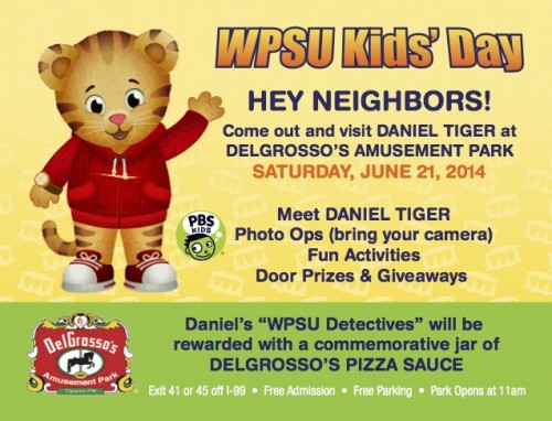 Tipton, Pennsylvania – PBS Character Daniel Tiger from “Daniel Tiger’s Neighborhood” is coming to DelGrosso’s Amusement Park on Saturday, June 21st, 2014 for WPSU Kid’s Day at the park!